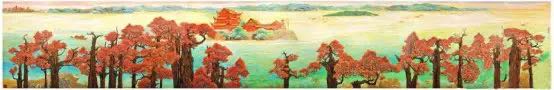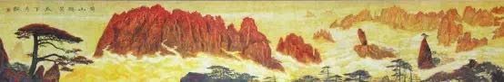 合肥新橋國際機場航站樓內巨幅漆壁畫《黃山勝景天下奇觀》,寬36米、高6.6米。畫面上,萬仞壁立、松濤謖謖、云卷云舒,具有強烈的視覺震撼力和賞心悅目的藝術感染力。壁畫再現了黃山旭日東升的輝煌時刻。碧紫紅透的基調中,千峰萬壑,氣勢恢宏;金色陽光、虬松云濤,昂揚奮進的力量撲面而來。