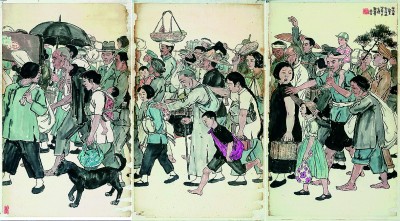 張安治的三聯(lián)畫《避難群》,表現(xiàn)的是在日軍空襲預(yù)警中緊急避難的桂林百姓。近四十名男女老幼簇?fù)沓审@惶的人流,每個人都被賦予了獨(dú)特的外貌特征與情感狀態(tài)。盲人拄杖、婦女抱兒、孩童牽母、主仆相扶,或頂籃、或提箱、或挑擔(dān)、或背包,步履慌亂間,生活的重量和命運(yùn)的無常一并壓在肩頭。而那些粗布衫下繃緊的肌肉線條,因急促呼吸而鼓脹的衣襟褶皺,亦在烘托緊張不安的氣氛。畫面最左側(cè),畫家描繪了一位回望的婦女,在她的腳邊還有一只緊緊追隨的黑狗,其忠誠天性令人感慨。婦人的視線讓人不禁想象:她在望什么?是身后已經(jīng)看不見的家人,還是遠(yuǎn)處那可能永遠(yuǎn)回不去的家?這是對家、對故鄉(xiāng)本能眷戀的一望,然而,她身后已無家可回,身前其實(shí)也無路可走。