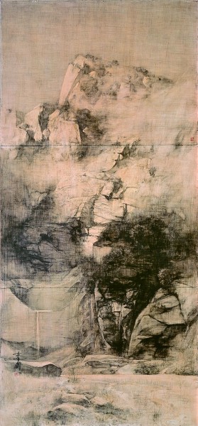 面對這一課題,藝術(shù)家曹吉岡想到了從中國傳統(tǒng)山水畫中尋找答案。他的諸多坦培拉作品從造型到筆觸都高度融合了中國山水畫技法。如在創(chuàng)作《幽燕古道》(圖③)時,他借鑒水墨暈染的技法將山石等景致進(jìn)行虛化處理,以求空靈的意境;而在《秋山靜月》的創(chuàng)作中,大量流淌、飛濺的墨痕,則彰顯出中國水墨獨(dú)有的寫意氣韻。