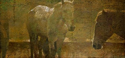 藝術(shù)家李曉剛的創(chuàng)作便是典型的案例,他以較為小眾的“酪素坦培拉”作為主要創(chuàng)作媒介,形成了獨(dú)特的畫面效果。干酪素是乳制品中的提取物,將硼砂加入水后再隔水加熱使其充分溶解可制成硼砂溶液,之后將干酪素加入硼砂溶液中攪拌均勻,便可制成酪素乳液。以酪素乳液調(diào)和的顏料具有凹凸不平的顆粒感,適宜營造粗獷、斑駁的畫面質(zhì)感。如在《小院》《兩個鐵皮桶》《兩匹老馬》(圖④)等作品中,李曉剛極具創(chuàng)意地以酪素乳液、雞蛋黃與礦物顏料多層疊加的方式為畫面打底,試圖將“酪素坦培拉”與“雞蛋坦培拉”的材料特性相融合,再用刮刀反復(fù)刮擦畫面形成自然的肌理,不僅保留了坦培拉的柔和質(zhì)感,還賦予作品滄桑之美,傳達(dá)出神秘、悠遠(yuǎn)的意境。
