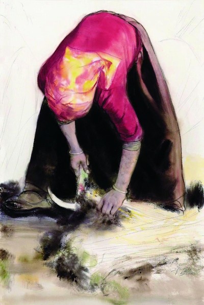除了描繪自然景觀,濕畫法還被廣泛應用于塑造擁有光滑質感的物象,如絲綢、金屬、玻璃等。在應金飛的《逆光的肖像》中,女性人物的絲質襯衣呈現出柔和的光感,這樣的光感一方面來自衣紋暗部與亮部的明度對比,另一方面則借助濕畫法帶來的柔和過渡,凸顯了布料的柔軟與光滑。而在陳堅的《收割》(圖②)中,少數民族婦女的上衣同樣以濕畫法描繪,不同的是,畫家采用了質地較粗的水彩紙,并巧妙借助紙面的肌理塑造出顆粒感,使衣服面料呈現出似綢又似紗的質感。可見,畫家在創作中并非僅僅依賴技法本身,還需憑借經驗與巧思,靈活調動各類材料的特性,最終實現質感的精準表現。
