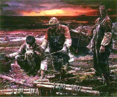 值得一提的是,在創作實踐中,畫家們也常常將濕畫法與干畫法進行有機結合,充分發揮二者優勢,使畫面剛柔相濟,虛實相生。如劉永健的《塵土人生》聚焦了礦工作業的場景,畫面前景人物的皮膚主要以濕畫法塑造,衣飾主要以干畫法刻畫;背景下方布滿銹跡的機械以干畫法營造出硬朗、斑駁的質感,上方的天空則以濕畫法繪就,通透潤澤,仿佛剛下過一場解暑的大雨,為富有力量感的畫面增添了一絲浪漫的氣息,剛與柔的對比展現出強烈的藝術張力。