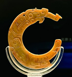在長江流域,距今5500年前后的安徽含山凌家灘遺址,發現過一件胸腹部有八角星紋的玉“鷹”,兩翅各有一個獸頭,發掘者稱其為豬頭,有人說是熊頭。其實這個造型與高廟白陶上飛鳳托舉八角星和龍的圖像,精神相通。這件玉器上的“鷹”或為鳳,獸頭或為龍頭。凌家灘還有單獨的卷曲形態玉龍,還發現一座大型祭壇,上面有的祭祀坑中燎燒后瘞埋大量玉石器,并出土了可能用于祀天的玉璧,顯然和高廟一樣存在過祀天儀式和敬天觀念。