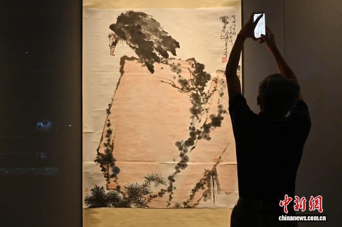 圖為潘天壽的《禿鷲圖》吸引參觀者拍照。中新社記者 陳楚紅 攝