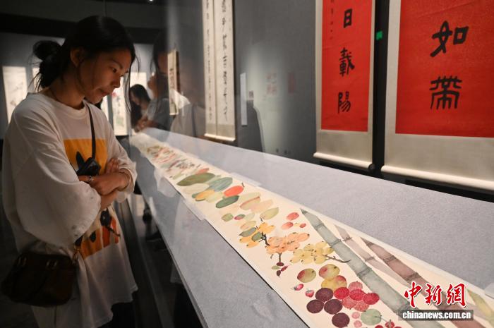 圖為丁仁的《設色百果圖》吸引參觀者。中新社記者 陳楚紅 攝