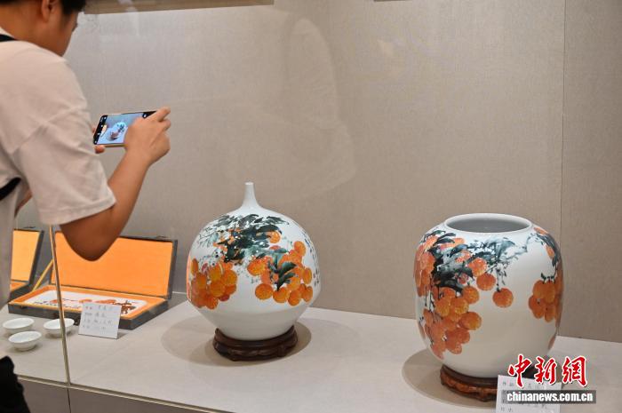 ??7月19日,“七月荔枝紅”主題書畫展展出的釉上五彩作品《大荔圖》吸引參觀者。近日,該展覽在廣州市廣州圖書館展出,以嶺南荔枝為主題,展現廣州白云區鄉村振興與嶺南文化魅力。中新社記者 陳楚紅 攝