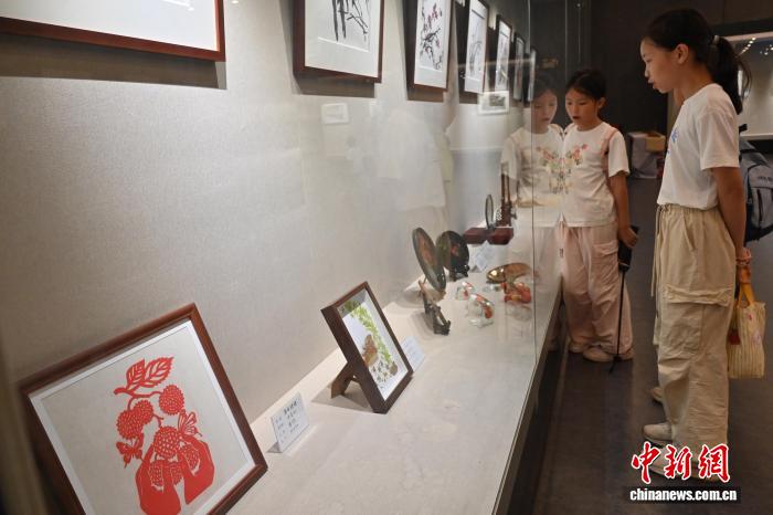 ??7月19日,“七月荔枝紅”主題書畫展展出的荔枝手工藝作品吸引參觀者。近日,該展覽在廣州市廣州圖書館展出,以嶺南荔枝為主題,展現廣州白云區鄉村振興與嶺南文化魅力。中新社記者 陳楚紅 攝
